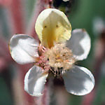 Blepharandra hypoleuca. a. Flowering branch. b. Node with stipules. c. Cincinnus, with one deciduous bracteole falling away. d. Flower, posterior petal uppermost. e. Posterior petal, adaxial view. f. Lateral petal, adaxial view. g. Stamens, lateral view (left), adaxial view (center), abaxial view (right). h. Gynoecium. i. Ovary, cross-section. j. Apex of style. k. Fruits, view from above (left) and from side (right).