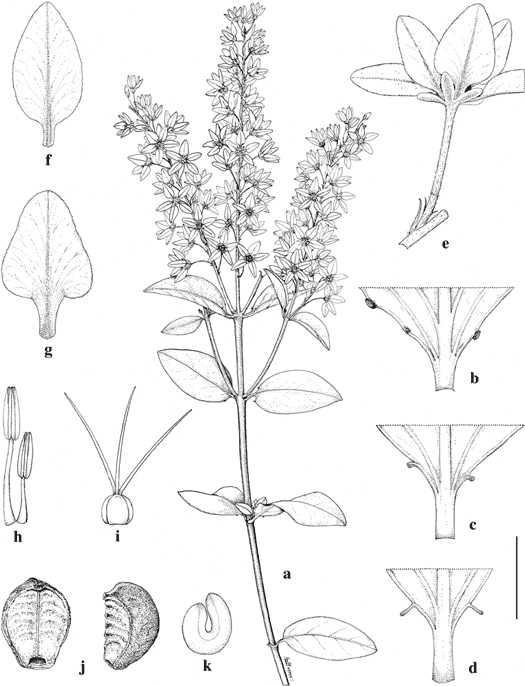 Galphimia multicaulis. a. Flowering branch. b–d. Leaf bases, abaxial view, to show variation in glands. e. Flower borne on pedicel and peduncle, with portion of inflorescence axis. f. Lateral petal. g. Posterior petal. h. Stamens, adaxial view, stamen at right opposite posterior petal, stamen at left opposite posterior-lateral sepal. i. Gynoecium. j. Cocci, adaxial view (left) and lateral view (right). k. Embryo.