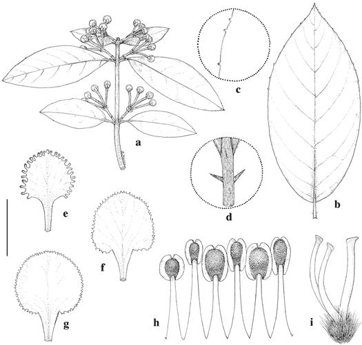 Hiraea hatschbachii. a. Branch with inflorescences in bud. b. Large leaf, adaxial view. c. Detail showing marginal leaf glands. d. Base of lamina and petiole bearing a pair of stipules. e. Posterior petal. f. Posterior-lateral petal. g. Anterior-lateral petal. h. Portion of androecium, abaxial view, the stamen at left opposite posterior petal. i. Gynoecium, anterior style at right. Scale bar equivalents: a, b, 4 cm; c, e–g, 5.7 mm; d, 8 mm; h, i, 2.7 mm. Based on: a, e–i, Hatschbach 39289, MICH; b–d, Hatschbach 39249, MICH. Drawn by Karin Douthit. First published in Edinburgh J. Bot. 71: 366. 2014; reproduced with permission of the author.