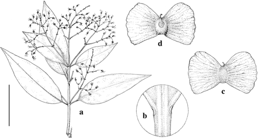 Psychopterys psilocarpa. a. Branch with old flowers. b. Apex of petiole to show glands. c. Samara, abaxial view. d. Samara, adaxial view. Scale bar equivalents: a, 4 cm; b, 4 mm; c, d, 1.3 cm. Based on Steyermark 45617, F. Drawn by Karin Douthit. First published in Contr. Univ. Michigan Herb. 25: 131. 2007; reproduced with permission of the authors.