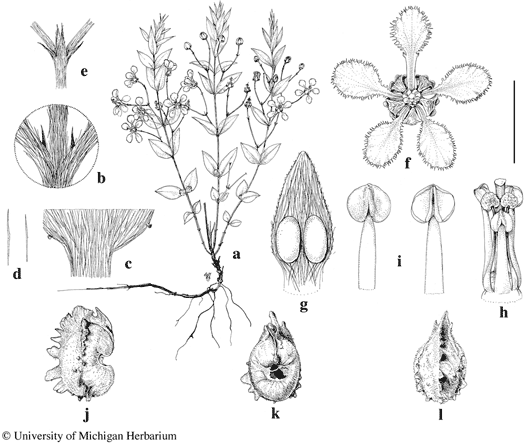 Aspicarpa salicifolia. a. Habit. b. Node with stipules borne on base of petiole (hairs removed to reveal stipules). c. Base of lamina with glands. d. Leaf hairs, from abaxial surface (left) and adaxial surface (right). e. Base of pair of peduncles, with four bracts. f. Chasmogamous flower, posterior petal uppermost. g. Sepal from chasmogamous flower, abaxial view. h. Androecium and gynoecium from chasmogamous flower, the stamen in center opposite anterior sepal. i. Fertile stamen from chasmogamous flower, distal portion, abaxial view (left) and adaxial view (right). j, k, l, cocci from cleistogamous flower, lateral view (j), adaxial view (k), abaxial view (l). Scale bar equivalents: a, 4 cm; b–d, 2 mm; e, 5.7 mm; f, 8 mm; g, 2.7 mm; h, 4 mm; i, 2 mm; j–l, 5 mm. Based on: a–e, Hassler 9129, G; f–h, Hassler 7046, P; j–l, Hatschbach 25228, NY. Drawn by Karin Douthit. © University of Michigan Herbarium.