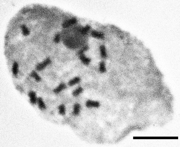 Meiotic chromosome figure, prophase I, n = 20. Scale bar = 5µm. Greenhouse material grown from