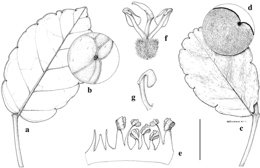 Stigmaphyllon crenatum. a. Glabrous leaf. b. Detail of margin and abaxial surface of glabrous lamina. c. Pubescent leaf. d. Detail of margin and abaxial surface of pubescent lamina. e. Androecium laid flat, adaxial view, fourth stamen from right opposing anterior sepal (anthers of stamens opposing posterior petal and posterior-lateral sepals not seen). f. Gynoecium, anterior style in the center. g. Lateral view of a posterior style. Scale bar equivalents: a, 4 cm; b, 1 cm; c, 4 cm; d, 1 cm; e, 4 mm; f, g, 2.7 mm. Based on: a, b, Duarte 4000, RB; c–g, Buena 156, R. Drawn by Karin Douthit. First published by C. Anderson in Contr. Univ. Michigan Herb. 19: 420. 1993.