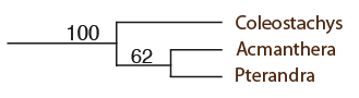 The Acmanthera clade is supported strongly by both molecular and morphological evidence, as is evident in the phylogenetic tree shown above. That tree is from Davis & Anderson (2010 [pdf]); the numbers above the branches are bootstrap values. In all three genera the carpels are distinct even in the ovary, with each developing into a dry, unwinged, brittle-walled, subspheroidal coccus; such fruits are found in no other clade of Malpighiaceae. In the Galphimia clade, which has similar-looking mericarps, the carpels are connate along a central axis in the ovary and the fruit is schizocarpic.