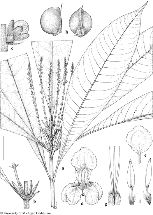 Coleostachys genipifolia. a. Flowering branch. b. Node to show stipules and bracts at base of spikes. c. Flower bud on axis of spike. d. Flower, posterior petal uppermost. e. Posterior petal, adaxial view. f. Stamens, adaxial view (left) and side view (right). g. Gynoecium. h. Cocci, side view (left) and adaxial view (right). Scale bar equivalents: a, 6.7 cm; b, 4 cm; c, 6.7 mm; d, e, 8 mm; f, g, 4 mm; h, 8 mm.—Based on: a, c, Ducke 228, US; b, Rosa 2424, NY; d–g, Nascimento 385, MICH; h, Silva & Pinheiro 5073, NY. Drawn by Karin Douthit. © University of Michigan Herbarium.