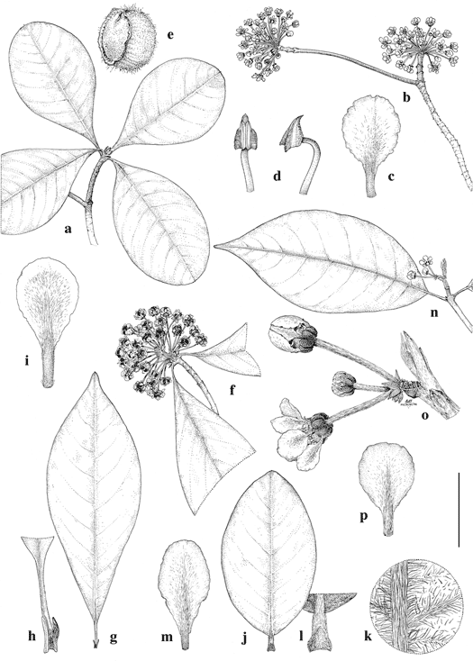 n–p, P. mcphersonii. n. Terminal portion of shoot with one leaf and old inflorescence (only one fascicle remaining). o. Fascicle of flowers, borne on a short projection. p. Petal, abaxial view. Scale bar equivalents: a, b, f, g, j, n, 4 cm; c, e, i, m, p, 4 mm; d, 2.7 mm; h, l, 1.3 cm; k, 2 mm; o, 8 mm.—Based on: a–d, Lisbôa 2507, NY; e, Pinheiro 12, MICH; f–i, Callejas et al. 4656, MICH; j–l, Moraes M. & Takaná G. 1857, MICH; m, Anderson 12298, MICH; n–p, McPherson 11745, MO. Drawn by Karin Douthit. First published in Contr. Univ. Michigan Herb. 21: 13. 1997; reproduced with permission of the author.