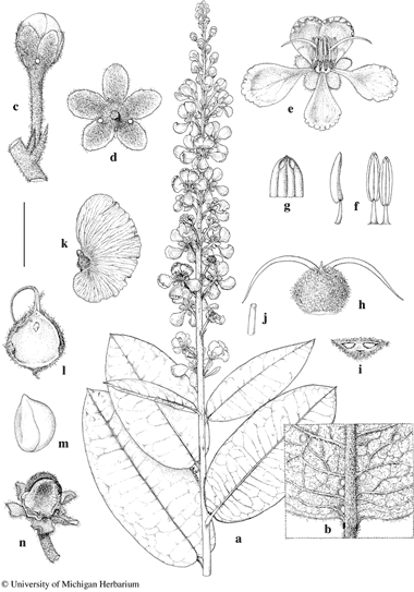 Acridocarpus spectabilis. a. Flowering branch. b. Base of lamina, abaxial view. c. Flower bud subtended by a bract and two bracteoles. d. Calyx from below, showing two tiny glands at base of two sepals. e. Flower, with two posterior petals uppermost. f. Stamens, lateral view (left) and adaxial view (right). g. Distal portion of anther, adaxial view. h. Gynoecium. i. Cross-section of ovary. j. Distal portion of style. k. Samara, lateral view. l. Ventral areole of nut of samara. m. Embryo. n. Old flower after fall of samaras, showing the pyramidal torus and the persistent sterile locule. Scale bar equivalents: a, 4 cm; b, 8 mm; c, 5.7 mm; d, 8 mm; e, 1.3 cm; f, 5.7 mm; g, 2.7 mm; h, i, 5.7 mm; j, 0.4 mm; k, 4 cm; l–n, 8 mm. Based on: a–j, Jongkind 2016, MO; k–n, Jongkind 2216, MO. Drawn by Karin Douthit. © University of Michigan Herbarium.
