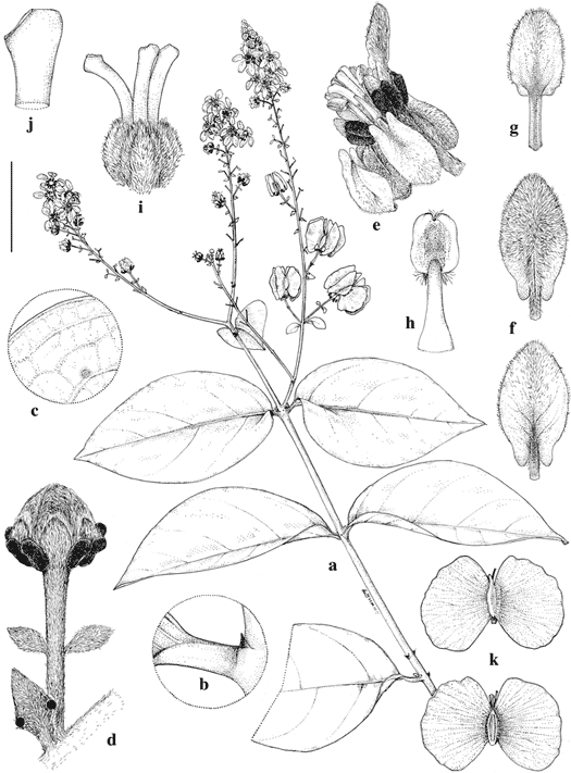 Amorimia rigida. a. Branch with flowers and immature fruits. b. Petiole and stipule. c. Abaxial surface of lamina showing gland. d. Flower bud. e. Flower, side view, posterior petal uppermost. f. Lateral petals, abaxial view above, adaxial view below. g. Posterior petal, adaxial view. h. Stamen, abaxial view. i. Gynoecium with anterior style to left. j. Apex of style. k. Samaras, abaxial view above, adaxial view below. Scale bar equivalents: a, 4 cm; b–d, 4 mm; e, 6 mm; f, g, 4 mm; h, i, 2 mm; j, 0.7 mm; k, 2 cm. Based on: a–j,