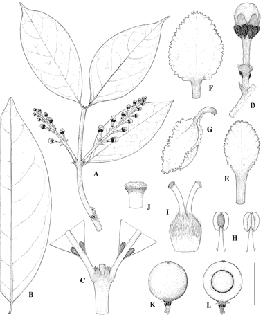 Bunchosia andina. A. Branch with inflorescences in bud. B. Large leaf, abaxial view. C. Node with base of leaves, abaxial view, showing stipules and glands. D. Flower bud. E. Posterior petal, adaxial view. F. Posterior-lateral petal, adaxial view. G. Anterior-lateral petal, lateral view. H. Stamens, abaxial view (left) and adaxial view (right). I. Gynoecium. J. Apex of style. K. Intact fruit. L. Fruit in longitudinal section to show thick flesh and one large seed. Scale bar equivalents: A, B, 4 cm; C, 4 mm; D, 8 mm; E–H, 4 mm; I, 2 mm; J, 1 mm; K, L, 4 cm. Based on: A, C–J, Holmgren 401 (S); B, Cuatrecasas 21949 (F); K, García-Barriga 17606 (AAU); L, Cerón et al. 923 (MO). Drawn by Karin Douthit. First published in Edinb. J. Bot. 77: 496. 2020; reproduced with permission of the author.