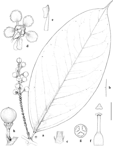 Bunchosia berlinii. a. Leaf, abaxial view, and fruiting inflorescence. b. Hair from abaxial surface of lamina. c. Stipules on base of petiole, abaxial view. d. Flower, posterior petal uppermost. e. Stamen, side view. f. Gynoecium, with separate view of stigma from above. g. Cross-section of ovary. h. Fruit. Scale bar equivalents: a, 4 cm; b, 1.3 mm; c, d, 8 mm; e, f, 2 mm; g, 1.3 mm; h, 1.3 cm. Based on: a–c, h, Berlin 1777, MICH; d–g, Berlin 856, MICH. Drawn by Karin Douthit. First published in Contr. Univ. Michigan Herb. 16: 62. 1987; reproduced with permission of the author.