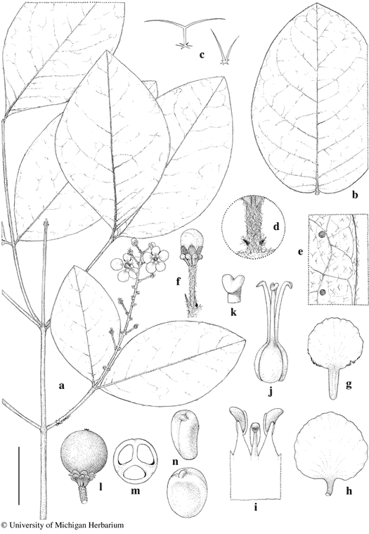 Scale bar equivalents: a, b, 4 cm; c, 0.8 mm; d, 4 mm; e–h, 8 mm; i, j, 2.7 mm; k, 1 mm; l, m, 1.3 cm; n, 1 cm. Based on: a, c–e, Hopkins et al. 579, MICH; b, Clarke 513, MICH; f–k, Prance et al. 9546, MICH; l–n, Lima et al. 818, MICH. Drawn by Karin Douthit. © University of Michigan Herbarium.