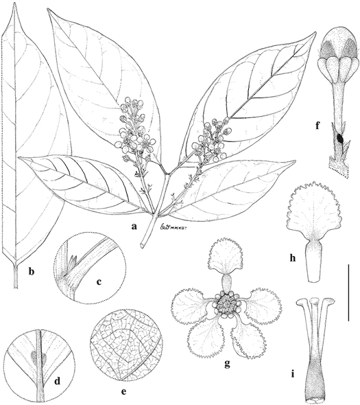 Bunchosia neillii. a. Flowering branch. b. Large leaf, adaxial view. c. Base of petiole bearing stipules. d. Base of lamina, abaxial view, showing paired glands. e. Detail showing leaf venation, abaxial view. f. Flower bud. g. Flower, posterior petal uppermost. h. Posterior petal. i. Gynoecium.