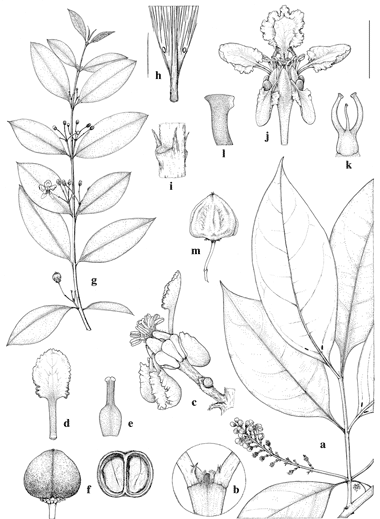 Bunchosia polystachia and Malpighia martinicensis. a–f. B. polystachia. a. Flowering branch. b. Node to show epipetiolar stipules. c. Flower, side view, posterior petal uppermost. d. Posterior petal. e. Gynoecium. f. fruit (left) and in cross section (right). g–m. M. martinicensis. g. Flowering branch. h. Abaxial base of leaf with one hair detached. i. Node to show interpetiolar stipules. j. Flower, posterior petal uppermost. k. Gynoecium, anterior style in center. l. Apex of posterior style. m. Fruit. Scale bar equivalents: a, 4 cm; b, 4 mm; c, 5.7 mm; d, 5 mm; e, 4 mm; f, 1.3 cm; g, 4 cm; h, i, 4 mm; j, 5.7 mm; k, 5 mm; l, 1 mm; m, 1 cm. Based on: a–e, Wasshausen & Ayensu 353, US; f, Ernst 1960, US; g, Duss 1478, US; h, m, Stehlé et al. H-3202, US; i–l, Proctor 21064, US. Drawn by Karin Douthit. First published by W. R. Anderson in Fl. Lesser Antilles 4: 601. 1988.