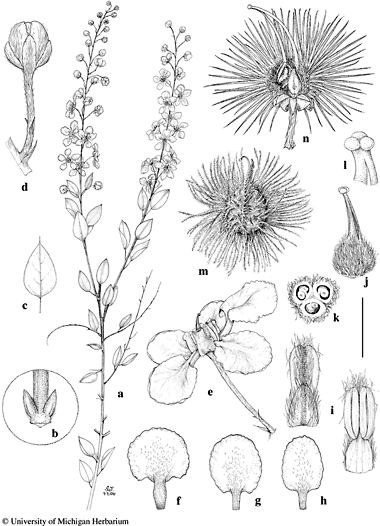 Scale bar equivalents: a, 4 cm; b, 2 mm; c, 4 cm; d, 6.7 mm; e–h, 8 mm; i, 2 mm; j, k, 2.7 mm; l, 1 mm; m, n, 4 mm. Based on: a, b, d, Feddema 2370, MICH; c, e–m, McVaugh 25850, MICH; n, Muller 3281, MICH. Drawn by Karin Douthit. © University of Michigan Herbarium.