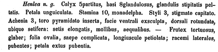 Henlea Griseb. is usually cited as having been published in Abh. Königl. Ges. Wiss. Göttingen 9: 37. 1860, but that volume was not published until 1861. The name Henlea was published on p. 37 of an 1860 preprint of an article with the title, "Erläuterungen ausgewählter Pflanzen des tropischen Amerikas." We have not seen that preprint; the description reproduced above is from p. 37 of the Abhandlungen. We assume the text was not changed from the preprint.