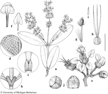 Blepharandra angustifolia. a. Flowering branch. b. Node with stipules. c. Adaxial view of petiole with pair of stipules, hairs removed. d. Venation of lamina, abaxial surface. e. Cincinnus, oldest flower at left. f. Posterior petal (left) and lateral petal (right), adaxial views. g. Stamen, lateral view. h. Gynoecium. i. Apex of style. j. Fruits, view from above (left) and from side (right). Scale bar equivalents: a, 4 cm; b, c, 8 mm; d, 4 mm; e, 8 mm; f, 5 mm; g, h, 2.7 mm; i, 0.8 mm; j, 4 mm.—Based on: a, b, Maguire & Wurdack 34480, MICH; c, j, Davidse et al. 17055, MICH; d, g–i, Huber & Medina 5860, MICH; e, f, Huber 3391, MICH. Drawn by Karin Douthit. © University of Michigan Herbarium.