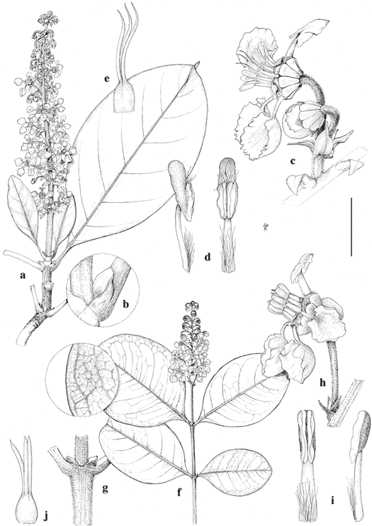 Scale bar equivalents: a, 4 cm; b, c, 8 mm; d, 2.7 mm; e, 4 mm; f, 4 cm (1.3 cm); g, h, 8 mm; i, 2.7 mm; j, 4 mm.—Based on: a–e, dos Santos 479, MICH; f–j, Mori & Benton 13158, MICH. Drawn by Karin Douthit. First published in Contr. Univ. Michigan Herb. 15: 112. 1982; reproduced with permission of the author.