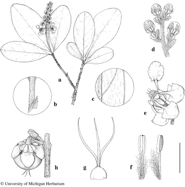 Byrsonima bucidifolia. a. Flowering branch. b. Stipules on inner base of petiole. c. Abaxial leaf surface to show persistent hairs. d. Flower buds. e. Flower, lateral view, posterior petal uppermost. f. Stamens, adaxial view (left) and lateral view (right). g. Gynoecium. h. Fruit. Scale bar equivalents: a, 4 cm; b, c, 4 mm; d, e, 8 mm; f, g, 2.7 mm; h, 1 cm. Based on: a–c, Lundell & Lundell 7772, MICH; d–g, Lundell & Lundell 7448, MICH; h, Davidse et al. 20622, MICH. Drawn by Karin Douthit. © University of Michigan Herbarium.