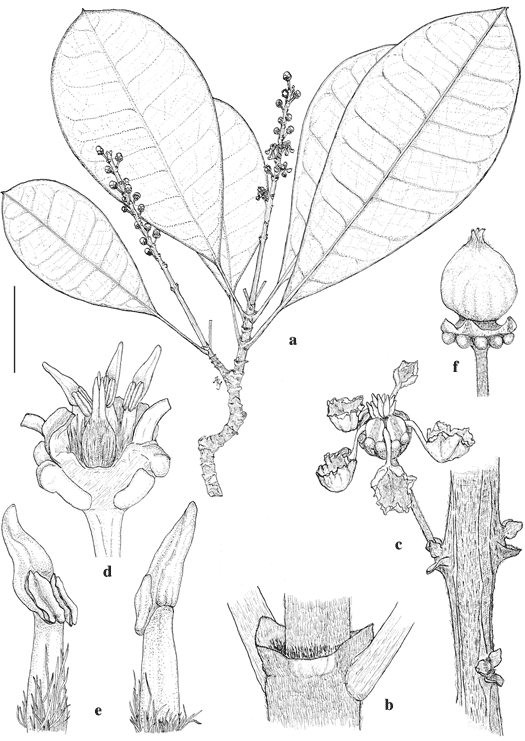 Byrsonima christianeae. a. Flowering branch. b. Node with stipules. c. Flower on inflorescence axis, posterior petal uppermost. d. Cutaway view of flower, showing gynoecium and three stamens. e. Stamens, oblique adaxial view (left) and oblique abaxial view (right). f. Immature fruit.
