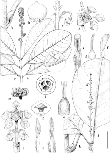 j–p. B. souzae. j. Leaves and axis of inflorescence. k. Stipules. l. Reconstructed cymule, the flower with posterior petal uppermost. m. Apex of peduncle to show bracteoles of cymule. n. Stamens, side view (left) and adaxial view (right). o. Gynoecium. p. Fruit, with flesh and base in longitudinal section to expose the nut.