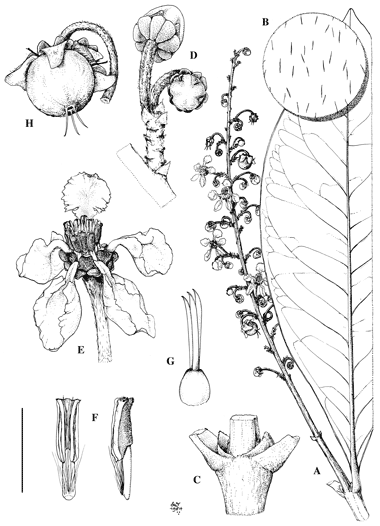 Byrsonima goiana. A. Node with large leaf, abaxial view, and inflorescence. B. Detail of abaxial laminar surface showing sparse vesture. C. Node with two leaf bases and completely connate stipules. D. Two flower buds. E. Flower, posterior petal uppermost. F. Stamens, adaxial view (left) and lateral view (right). G. Gynoecium, anterior style at right. H. Fruit borne on circinate pedicel. Scale bar equivalents: A, 4 cm; B, 2 mm; C, 1.3 cm; D, H, 1 cm; E, 8 mm; F, G, 4 mm. Based on: A–G, Heringer 14435 (MICH); H, Heringer et al. 3115 (MICH). Drawn by Karin Douthit. First published in Edinb. J. Bot. 77: 512. 2020; reproduced with permission of the author.
