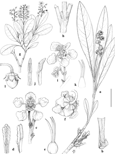Byrsonima. a–f. B. onishiana. a. Habit, including underground base. b. Intrapetiolar stipules on base of petiole. c. Flower, posterior petal uppermost. d. Stamens, adaxial view (left) and side view (right). e. Gynoecium, with styles bending away from posterior petal. f. Fruit drawn from behind to show enlarged sepals and persistent petals. g–l, B. spinensis. g. Flowering branch. h. Node with connate intrapetiolar stipules. i. Two-flowered cincinnus, the open flower with posterior petal at upper right. j. Stamens, adaxial view (left) and side view (right). k. Gynoecium, with styles bending away from posterior petal. l. Enlarging fruit. Scale bar equivalents: a, 4 cm; b, 5.7 mm; c, 8 mm; d, e, 2.7 mm; f, 1 cm; g, 4 cm; h, 4 mm; i, 8 mm; j, 2.7 mm; k, 4 mm; l, 8 mm.—Based on: a–f, Irwin et al. 25824, MICH; g–l, Anderson et al. 35339, MICH. Drawn by Karin Douthit. First published in Contr. Univ. Michigan Herb. 15: 97. 1982; reproduced with permission of the author.