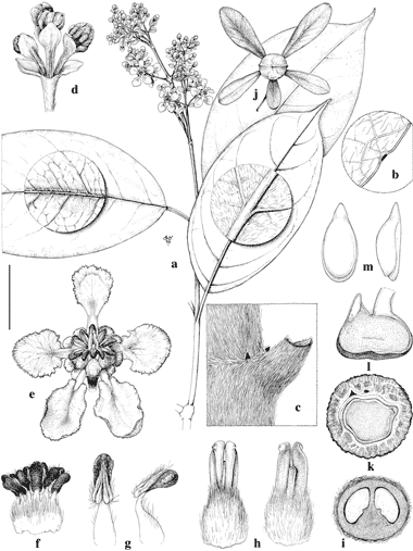 Dicella julianii and D. macroptera. a–j, D. julianii. a. Flowering branch, with enlargements of adaxial leaf surface (left) and abaxial surface (right). b. Margin of lamina, abaxial view, to show gland. c. Node with stipules. d. Decussate flower buds. e. Flower, posterior petal uppermost. f. Androecium, abaxial view. g. Stamens adaxial view (left) and side view (right). h. Gynoecium, viewed from posterior petal (left) and from anterior sepal (right). i. Cross-section of ovary with sterile anterior carpel at base. j. Fruit subtended by winglike sepals, the anterior sepal downward. k–m, D. macroptera. k. Cross-section of fruit to show thick wall with bundles of fibers and perisperm of single seed. l. Longitudinal section of seed, with tiny embryo at upper left, subtended by perisperm. m. Embryo, front view (left) and side view (right). Scale bar equivalents: a, 4 cm (8 mm); b, 4 mm; c, 2.2 mm; d, 1 cm; e, 8 mm; f, 4 mm; g, h, 2.7 mm; i, 1.3 mm; j, 4 cm; k, 1.3 cm; l, 8 mm; m, 2.7 mm. Based on: a, d–h, Klug 347, NY; b, Vásquez & Jaramillo 11104, MICH; c, Soejarto 4075, MICH; i, Schunke V. 9985, MICH; j, Fróes 23797, IAN; k–m, Anderson 6956, MICH. Drawn by Karin Douthit. Modified from a drawing first published by W. R. Anderson in Mem. New York Bot. Gard. 32: 282. 1981.