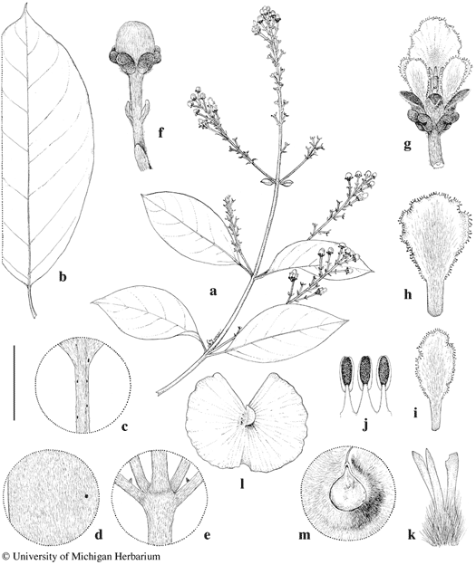 Scale bar equivalents: a, b, 4 cm; c, 8 mm; d, 4 mm; e, 8 mm; f, g, 5.7 mm; h, i, 4 mm; j, k, 2.7 mm; l, 4 cm; m, 6.7 mm. Based on: a–k, Cerón 1250, MICH; l, m, Stergios & Delgado 13478, MICH. Drawn by Karin Douthit. © University of Michigan Herbarium.