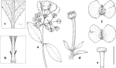 Callaeum johnsonii. a. Fruiting branch. b. Adaxial view of petiole, to show stipules. c. Abaxial view of base of lamina, to show vesture and marginal glands. d. Old flower, to show large bract and bracteoles. e. Adaxial view of apex of style, to show transversely expanded stigma. f. Samara, adaxial view (above) and abaxial view (below). Scale bar equivalents: a, 4 cm; b, c, 4 mm; d, 8 mm; e, 1 mm; f, 2 cm. Based on: a–e, Cavender s.n., WIS; f, Miranda 2549, MEXU. Drawn by Karin Douthit. First published in Acta Bot. Mex. 74: 181. 2006; reproduced with permission of the author.