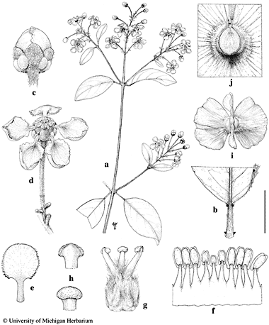 Scale bar equivalents: a, 4 cm; b, 8 mm; c, 5 mm; d, e, 8 mm; f, g, 2.7 mm; h, 1.3 mm; i, 4 cm; j, 1.1 cm. Based on: a–i, McVaugh 22857, MICH; j, Daniel 952, MICH. Drawn by Karin Douthit. © University of Michigan Herbarium.