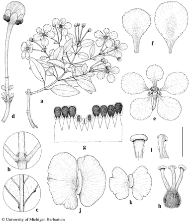 Callaeum septentrionale. a. Flowering branch. b. Node with epipetiolar stipules. c. Base of lamina, abaxial view, showing marginal glands. d. Flower bud in umbel. e. Flower, posterior petal uppermost. f. Petals, abaxial view, posterior petal (left) and lateral petal (right). g. Androecium laid out, abaxial view, the smallest stamen opposite posterior petal. h. Gynoecium. i. Distal portion of styles, adaxial view (left) and abaxial view (right). j. Samara, abaxial view. k. Samara, abaxial view. Scale bar equivalents: a, 4 cm; b, c, 4 mm; d, 8 mm; e, 1.3 cm; f, 8 mm; g, h, 2.7 mm; i, 1.3 mm; j, k, 2.7 cm. Based on: a–i, Daniel 287, MICH; j, Anderson 13314, MICH; k, Anderson & Laskowski 4078, MICH. Drawn by Karin Douthit. © University of Michigan Herbarium.