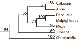 The Christianella clade as a whole is very strongly supported by molecular evidence—see the phylogenetic tree above, with bootstrap values above the branches, which is from Davis & Anderson (2010 [pdf]). In cases where more than one species of a genus was sampled the genera also enjoy strong support, as does the sister relationship of Flabellaria and Malpighiodes. On the other hand, support for structure within the tree is mostly lacking. The group is morphologically coherent in its samaras, all of which are "mascagnioid," i.e., with the lateral wings dominant and the dorsal wing mostly small; that similarity is somewhat obscured by the loss or modification of those wings in several species, presumably as an adaptation for dispersal by water.