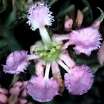 Jubelina magnifica. a. Flowering branch. b. Abaxial surface of lamina, with gland and hairs. c. Hair from abaxial surface of lamina. d. Stem hairs. e. Flower, posterior petal uppermost. f. Gynoecium. g. Samara, abaxial view (right) and cross-section (left). Scale bar equivalents: a, 4 cm; b, 2 mm; c, d, 0.8 mm; e, 8 mm; f, 2 mm; g, 4 cm. Based on: a–f, Maguire et al. 36748, NY; g, Wurdack & Adderley 43579, NY. Drawn by Karin Douthit. First published in Mem. New York Bot. Gard. 32: 229. 1981; reproduced with permission of the author.