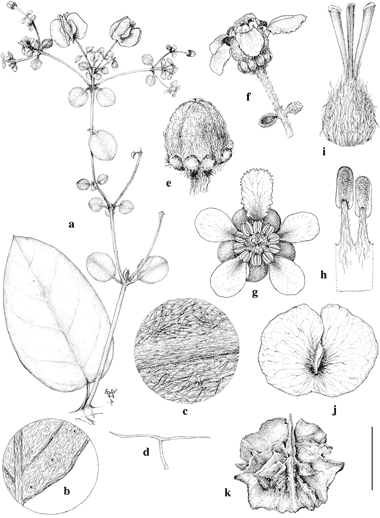 Malpighiodes. a–j, M. guianensis: a. Flowering and fruiting branch. b. Abaxial base of lamina to show glands. c. Abaxial surface of lamina. d. Detached hair from abaxial surface of lamina. e. Flower bud. f. Flower, lateral view, posterior petal to right. g. Flower from above, posterior petal uppermost. h. Stamens, abaxial view, the stamen on left opposite a sepal. i. Gynoecium. j. Samara, abaxial view. k, M. bracteosa, mericarp, abaxial view. Scale bar equivalents: a, 3 cm; b, 8 mm; c, 1 mm; d, 0.6 mm; e, 3 mm; f, 6 mm; g, 5 mm; h, i, 2 mm; j, 2 cm; k, 1 cm. Based on: a, c, d, j, Gleason 825, NY; b, h, Cremers 8143, MICH; e, f, i, Forest Dept. 3644, NY; g, Maas & Westra 3563, MICH; k, Ducke 1169, NY. Drawn by Karin Douthit. Modified from a drawing first published in Mem. New York Bot. Gard. 32: 214. 1981; reproduced with permission of the author.