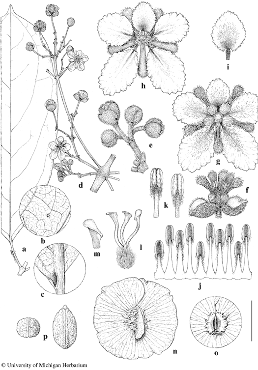 Mezia beckii. a. Large leaf, abaxial view. b. Enlargement of abaxial surface of lamina. c. Glands at base of lamina, abaxial view. d. Inflorescence. e. Umbel of flower buds. f. Flower subtended by bracteoles, anterior sepal in center, petals removed (note gland on one bracteole). g. Flower from below, posterior petal uppermost. h. Flower from above, posterior petal uppermost. i. Posterior petal, abaxial view. j. Androecium laid out, abaxial view, stamen above "j" opposite posterior petal. k. Anthers, adaxial view, from opposite sepal (left) and from opposite petal (right). l. Gynoecium, anterior style at left. m. Distal portion of style. n. Samara, abaxial view. o. Nut of samara, adaxial view. p. Embryo, from below (left) and from side (right).