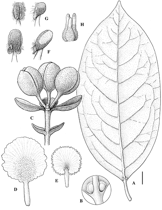 Scale bar equivalents: A, 1 cm; B, 2.5 mm; C, 3 mm; D, E, 2.2 mm; F, G, 0.6 mm; H, 2 mm. Based on Fanshawe 2698, NY. Drawn by John Megahan. First published online, Edinburgh J. Bot. in 2018; reproduced with permission of the authors.