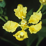 Woody vine; stipules small, triangular, borne on stem between petioles, distinct or adjacent stipules connate, persistent; petiole eglandular or distally biglandular; lamina bearing glands in abaxial surface. Inflorescence a terminal and lateral panicle, the flowers borne in decussate 4-flowered umbels, 6-flowered corymbs, or pseudoracemes; floriferous peduncle well developed; bracts and bracteoles eglandular. Sepals leaving outermost petal exposed in enlarging bud, eglandular, strongly reflexed in anthesis; corolla bilaterally symmetrical, the posterior petal very different from the lateral 4; petals light yellow, glabrous; lateral petals with the margin dentate; androecium bilaterally symmetrical; stamens 10, all fertile; filaments longer opposite sepals than opposite petals, connate at base, glabrous; anthers all bearing tufts of hairs at base and apex of locules, strongly heteromorphic, of 3 types: 5 anthers opposite sepals introrse, the locules much exceeded by the globose glandular connective; 3 anthers opposite anterior-lateral petals and posterior petal like those opposite sepals but with the glandular connective not or barely exceeding the locules; 2 anthers opposite posterior-lateral petals latrorse, much reduced, the connective hardly developed and nonglandular; pollen globally symmetrical, with several non-parallel colpi and non-equatorial pores; receptacle glabrous on both sides of stamens; gynoecium bilaterally symmetrical; carpels 3, broadly connate in ovary, all fertile; styles 3, with large internal stigmas; anterior style dorsally extended at apex in a hook bearing pendent triangular folioles; 2 posterior styles laterally flattened, truncate at apex and coherent or connate along their upper edges. Fruit dry, breaking apart into samaras separating from a short pyramidal torus; samara with the dominant wing elongated and apparently dorsal, thickened on abaxial edge and bent upward, the veins terminating in the thinner adaxial edge (resembling a samara of Heteropterys); nut bearing 1 or 2 winglets or crests on one side. Chromosome number: n = 8 (W. R. Anderson, 1993a); photos.