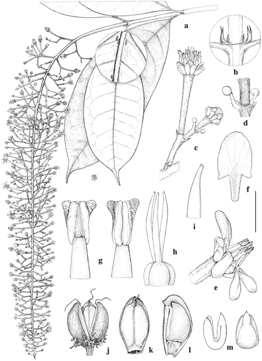 Andersoniodoxa hammelii. a. Flowering branch, with enlargement of abaxial surface of lamina to show glands. b. Node to show stipules. c. Two-flowered cincinnus. d. Bracteole glands. e. Flower, side view, posterior petal uppermost. f. Posterior petal, adaxial view. g. Anthers, abaxial view (left) and adaxial view (right). h. Gynoecium. i. Distal portion of style. j. Fruit. k. Single mericarp, adaxial view. l. Mericarp in longitudinal section, with seed in position. m. Embryos, side view (left) and abaxial view (right). Scale bar equivalents: a, 3 cm (6 mm); b, c, 6 mm; d, 3 mm; e, 4 mm; f, 3 mm; g, 1 mm; h, 1.4 mm; i, 0.7 mm; j, 5 mm; k–m, 3.3 mm. Based on: a, b, Grayum 2231A, DUKE; c–m, Hammel 9397, MICH. Drawn by Karin Douthit. First published in Brittonia 35: 39. 1983 (as Lophanthera hammelii).