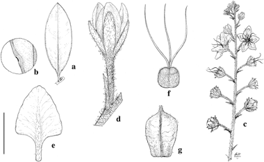 Galphimia amambayensis. a. Leaf. b. Detail of lamina showing marginal gland. c. Portion of inflorescence. d. Opening bud borne on pedicel, with portion of inflorescence axis. e. Petal, abaxial view. f. Gynoecium. g. Coccus, abaxial view. Scale bar equivalents: a, 4 cm; b, 8 mm; c, 2 cm; d–g, 4 mm. Based on Fernández Casas & Molero 6190, NY. Drawn by Karin Douthit. First published in Contr. Univ. Michigan Herb. 24: 3. 2005; reproduced with permission of the author.