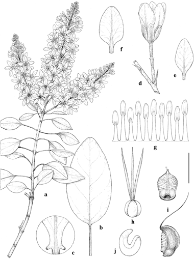 Galphimia floribunda. a. Flowering branch. b. Detached large leaf. c. Base of lamina. d. Opening flower, borne on pedicel and peduncle, with portion of inflorescence axis. e. Lateral petal. f. Posterior petal. g. Androecium laid out, abaxial view, the stamen at left opposite posterior petal. h. Gynoecium. i. Cocci, adaxial view (above) and lateral view (below). j. Embryo. Drawn by Karin Douthit.