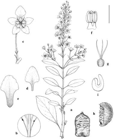 Galphimia mexiae. a. Flowering branch. b. Base of lamina, showing marginal glands. c. Flower with posterior petal uppermost, borne on pedicel and peduncle, with portion of inflorescence axis. d. Lateral petal. e. Posterior petal. f. Stamens, adaxial view, opposite posterior petal (left) and posterior-lateral sepal (right). g. Gynoecium. h. Cocci, lateral view (right) and adaxial view (left). i. Embryo. Scale bar equivalents: a, 4 cm; b, 8 mm; c, 1 cm; d, e, 5 mm; f–h, 4 mm; i, 2.7 mm. Based on: a–c, Anderson & Anderson 6122, MICH; d–g, Nelson 4060, US; h, i, Almeda 2543, MICH. Drawn by Karin Douthit. First published in Syst. Bot. 28: 718. 2003; reproduced with permission of the author.