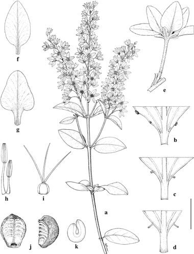 Scale bar equivalents: a, 4 cm; b–e, 8 mm; f, g, 5 mm; h, i, 4 mm; j, k, 2.7 mm. Based on: a, Jones 40975, MO; b, Díaz & Barriga 4760, MICH; c, Machuca 4412, XAL; d, e, j, k, King & Soderstrom 4671, MICH; f–i, Cházaro 5033, CHAPA. Drawn by Karin Douthit. First published in Contr. Univ. Michigan Herb. 25: 65. 2007; reproduced with permission of the author.