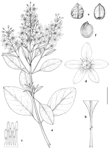 Galphimia paniculata. a. Flowering branch. b. Petiole, adaxial view. c. Partial androecium laid out, abaxial view, the stamen on left opposite posterior petal. d. Fruit from above, with petals persistent, posterior petal uppermost. e. Cocci, abaxial view (left) and adaxial view (right). f. Seed.