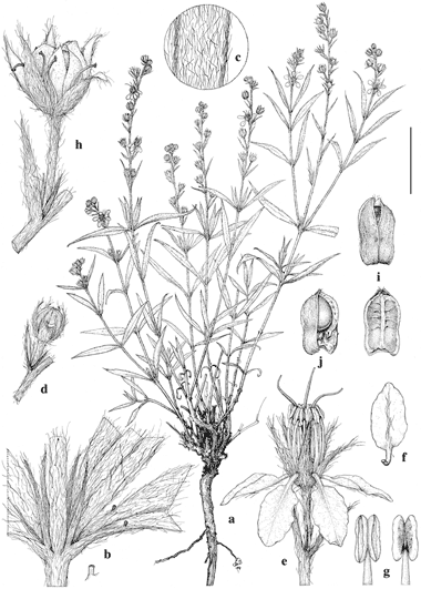 Scale bar equivalents: a, 4 cm; b, 4 mm (2 mm); c, 4 mm; d, 5.7 mm; e, f, 5 mm; g, 2 mm; h–j, 4 mm. Based on: a–d, White 3574, GH; e–j, Wiggins 7471, DS. Drawn by Karin Douthit. First published in Contr. Univ. Michigan Herb. 25: 43. 2007; reproduced with permission of the author.