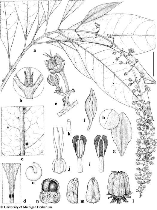 Lophanthera longifolia. a. Flowering branch. b. Node to show stipules. c, Enlargement of abaxial surface of lamina to show glands. d. Base of lamina (abaxial view) and distal portion of petiole, to show glands. e. Cincinnus with one old flower, one well-developed flower bud, and one embryonic flower bud. f. Keeled lateral petal. g. Posterior petal, flattened. h. Minutely denticulate margin of posterior petal. i. Anthers, adaxial view (left) and abaxial view (right). j. Gynoecium. k. Distal portion of style. l. Intact fruit. m. Detached cocci, lateral view (left) and adaxial view (right). n. Coccus laid open, with proximal chamber filled with aerenchyma and distal chamber containing seed. o. Embryo. Scale bar equivalents: a, 4 cm; b, 1.3 cm; c–e, 8 mm; f, g, 4 mm; h, 0.8 mm; i, j, 2.7 mm; k, 0.4 mm; l–n, 8 mm; o, 4 mm. Based on: a, b, d, Maguire et al. 36604, MICH; c, Prance 30113, MICH; e, Liesner 9002, MICH; f–k, Level L-25, MICH; l–o, Henderson & Guedes 1600, MICH. Drawn by Karin Douthit. © University of Michigan Herbarium.