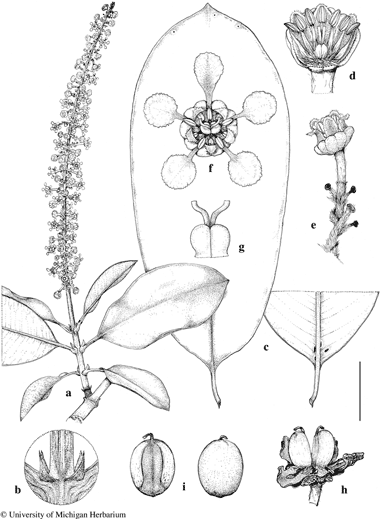 Scale bar equivalents: a, 4 cm; b, 1.3 cm; c, 4 cm; d, 4 mm; e, 8 mm; f, 4 mm; g, 2.7 mm; h, 5.7 mm; i, 4 mm. Based on: a, b, d, Aguilar 4560, CR; c, Hammel 17746, MO; e–g, Herrera 6675, K; h–i, Robles 2080, MO. © University of Michigan Herbarium.