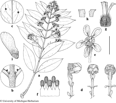 Heteropterys bicolor. a. Flowering branch. b. Node to show epipetiolar stipules. c. Abaxial surface of lamina to show glands. d. Flower buds with decurrent calyx glands adjacent to innermost petal, three views. e. Flower, innermost petal pointed downward. f. Portion of androecium laid out, abaxial view, stamen in center opposite innermost petal. g. Gynoecium, lateral view, anterior style to right. h. Distal portions of posterior style (left) and anterior style (right). i. Samara. Scale bar equivalents: a, 4 cm; b, 4 mm; c, 8 mm; d, e, 5.7 mm; f, 2.7 mm; g, 2 mm; h, 1.3 mm; i, 2 cm. Based on: a–h, Silva et al. 2215, MICH; i, Hatschbach 23480, MICH. Drawn by Karin Douthit. © University of Michigan Herbarium.