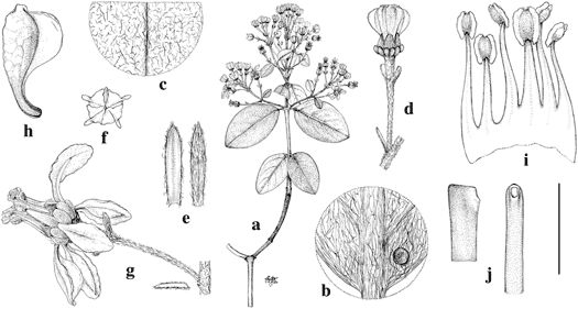 Heteropterys caducibracteata. a. Flowering branch. b. Enlargement of base of lamina, abaxial view. c. Enlargement of surface of lamina, adaxial view. d. Flower bud, with pedicel, bracteoles, peduncle, and bract. e. Bracts, adaxial view (left) and abaxial view (right). f. Flower bud from above, the posterior petal uppermost. g. Flower, posterior petal uppermost, with pedicel, bracteoles, peduncle, and falling bract. h. Lateral petal, side view to show dorsal wing. i. Partial androecium laid out, abaxial view, the stamen at right opposite posterior petal. j. Distal portions of styles, lateral view (left) and adaxial view (right). Scale bar equivalents: a, 4 cm; b, c, 4 mm; d, 1 cm; e, 2.7 mm; f, 8 mm; g, 6.7 mm; h, 4 mm; i, 2.7 mm; j, 1 mm.—Based on Anderson 11742, MICH. Drawn by Karin Douthit. First published in Contr. Univ. Michigan Herb. 15: 119. 1982; reproduced with permission of the author.