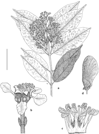 Heteropterys cuatrecasasii. a. Flowering branch. b. Flower, posterior petal to left. c. Androecium and gynoecium, the central stamen opposite posterior petal, the central style opposite anterior sepal. d. Samara. Scale bar equivalents: a, 4 cm; b, 5.7 mm; c, 2.7 mm; d, 2 cm.—Based on: a–c, Maguire et al. 30196, NY; d, Cowan & Wurdack 31339, MICH. Drawn  by Annette Seidenschnur Mahler. First published in Mem. New York Bot. Gard. 32: 192. 1981; reproduced with permission of the author.