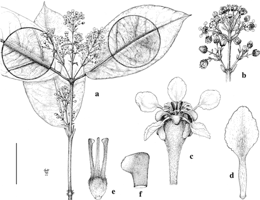 Heteropterys dichromocalyx. a. Flowering branch, with enlargements of abaxial leaf surface (left) and adaxial surface (right). b. Portion of inflorescence. c. Flower, posterior petal uppermost. d. Petal, abaxial view. e. Gynoecium. f. Distal portion of style. Scale bar equivalents: a, 4 cm (1.3 cm); b, 2 cm; c, 4 mm; d, 2 mm; e, 2.7 mm; f, 0.8 mm.—Based on Silva & Brazão 60610, MICH. Drawn by Karin Douthit. First published in Mem. New York Bot. Gard. 32: 194. 1981; reproduced with permission of the author.
